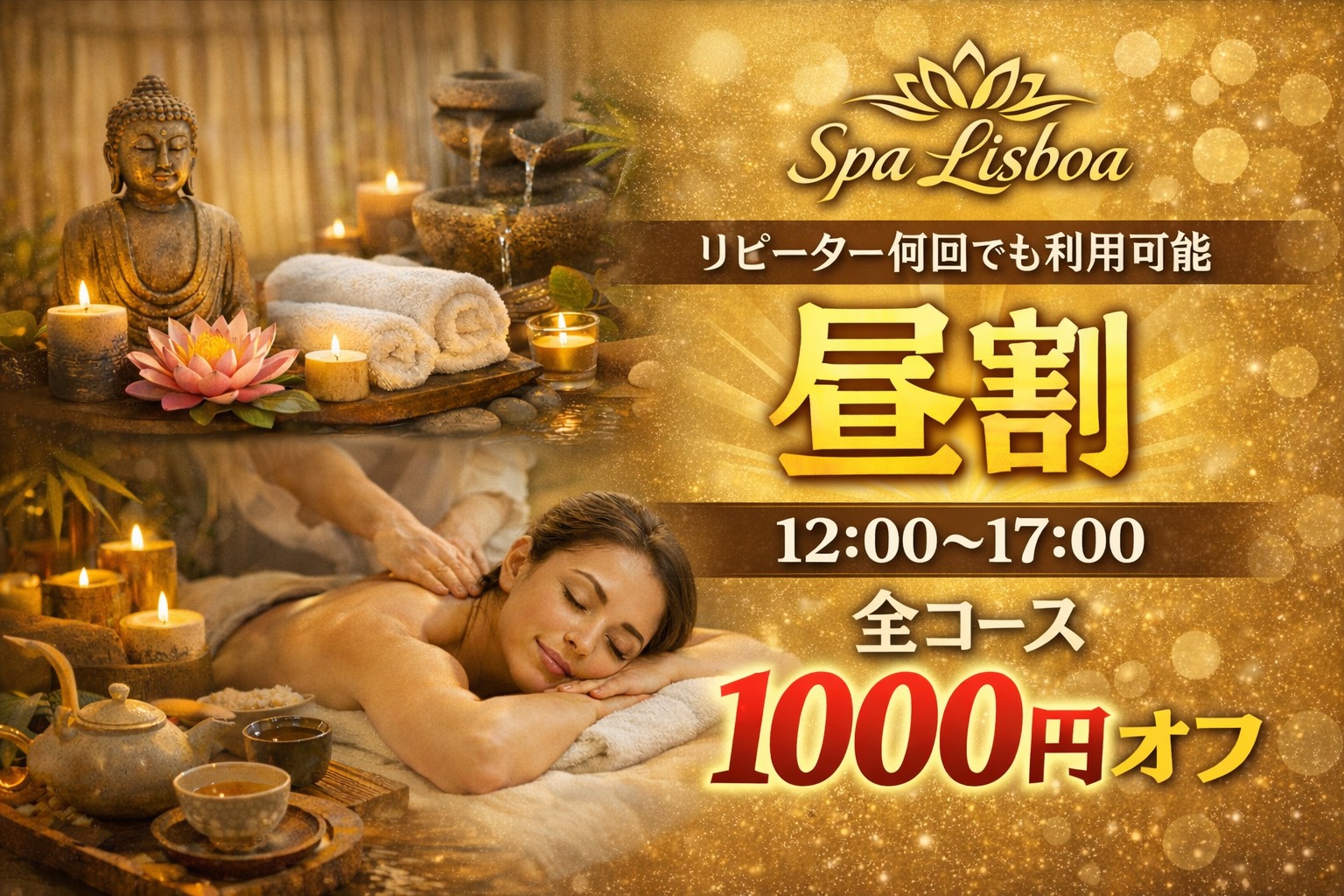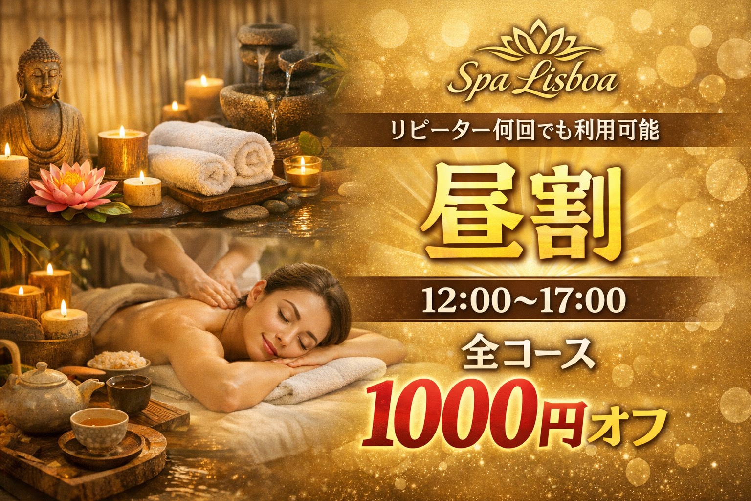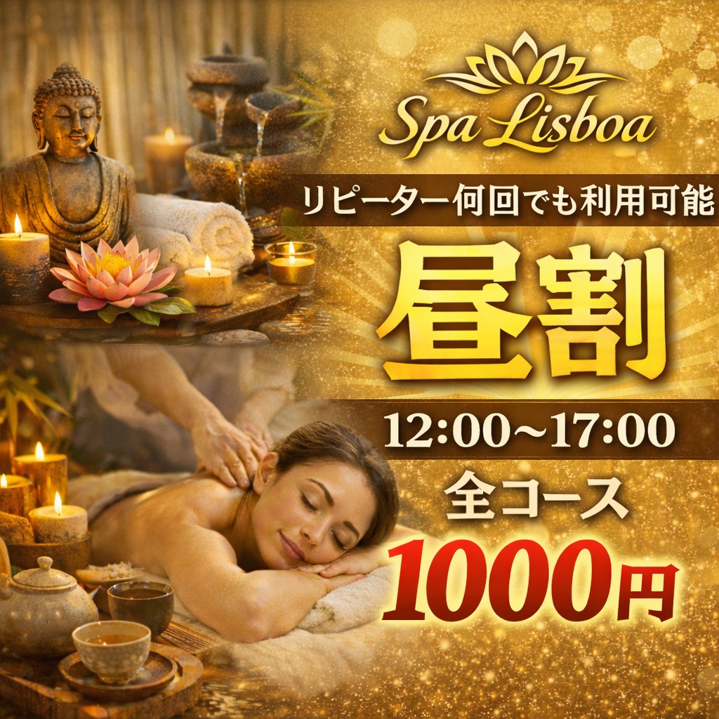 2026/03/03Spa Lisboa|昼割キャンペーンのご案内 大阪で癒しを求める大人の皆さまへ。 Spa Lisboaでは、12時~17時限定の「昼割」をご用意しております。 お昼のひととき、ゆったりとした空間で心と身体をリセット。 日常の合間にふっと力を抜ける、上質で落ち着いた時間をお過ごしいただけます。 さらに―― リピーター様は何度でもご利用可能。 いつもの安心感と、変わらない丁寧なおもてなしでお迎えいたします。 ✔ 12:00~17:00限定 ✔ リピーター様 何度でも利用OK ✔ ゆったり過ごせる昼の贅沢時間 お仕事の合間に。 休日のリフレッシュに。 少しだけ自分を甘やかす、特別な昼下がりを。 ご予約・お問い合わせはお早めに。 皆さまのご来店を心よりお待ちしております。